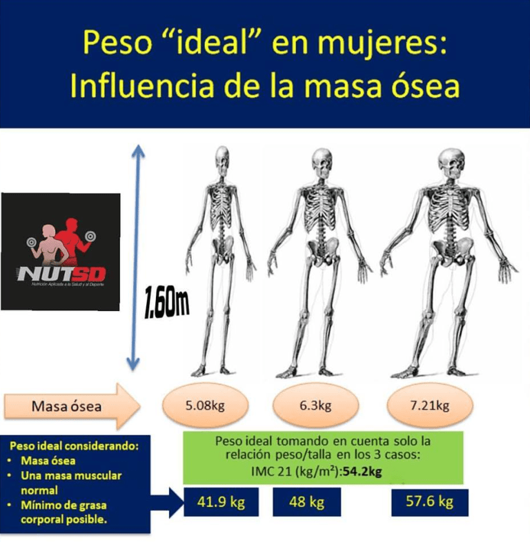 Como pueden darse cuenta podemos obtener el «peso ideal» de estas 2 formas sencillas, lo que podría ser útil en casos donde la masa ósea sea normal (aproximadamente unos 6.3kg). Pero ¿Qué pasa en mujeres que tienen una masa ósea mas chica de lo normal o más grande?